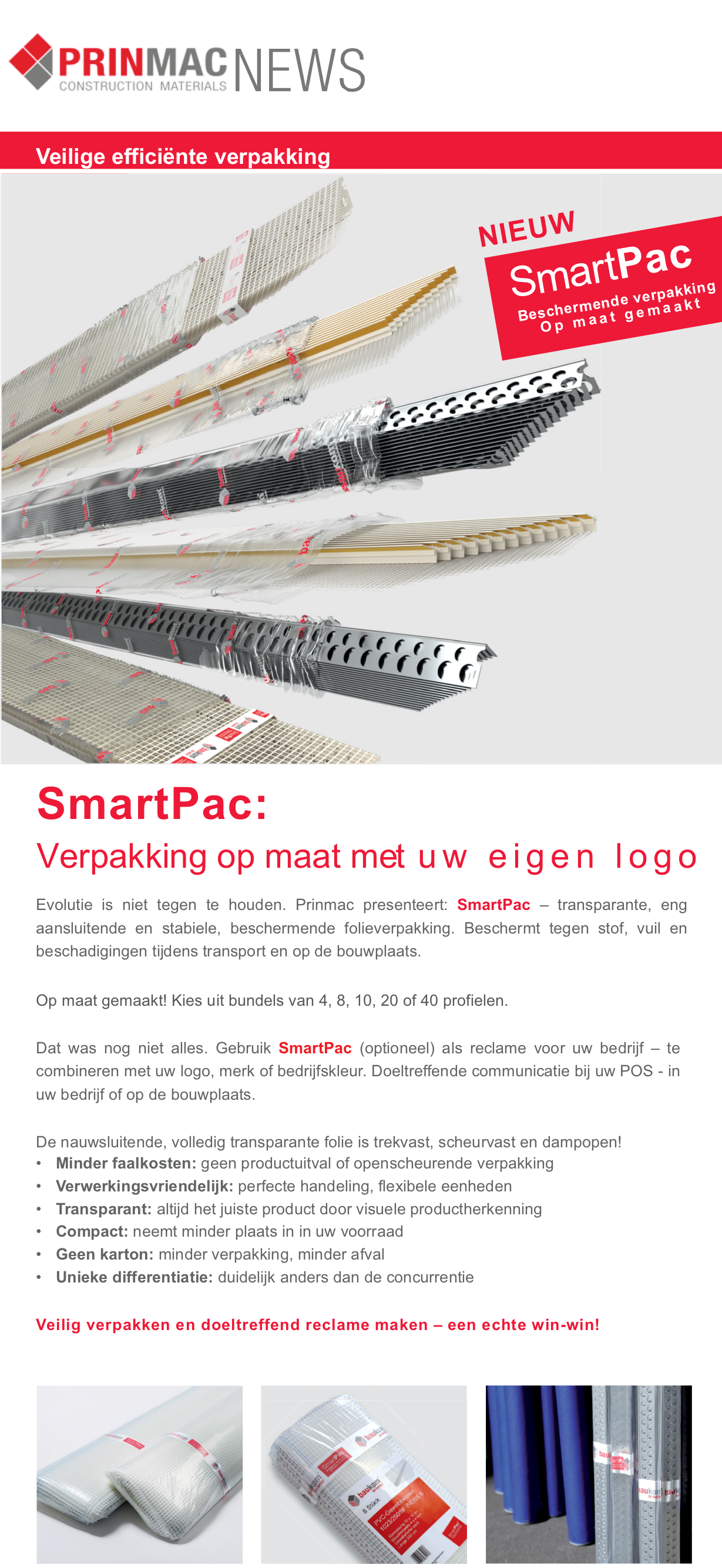 Nog maar korte tijd na de introductie van de baanbrekende kokerverpakking komt Prinmac met nog een nieuw verpakkingsconcept - SmartPac. Niet alleen beschermt de shrink wrap folie uitstekend tegen vuil-, vet- en stootschades, maar tevens kunnen wij de verpakkingsgrootte naar klantwens invullen. Of je nu een bundel van vier, acht, tien, 20 of 40 stucprofielen wilt - het kan allemaal! Op maat gemaakte verpakkingen van Prinmac nu ook in de Benelux verkrijgbaar.